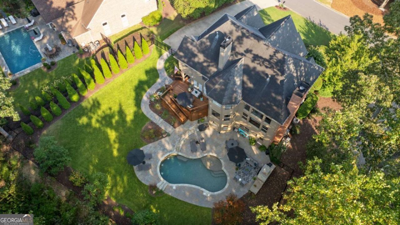 GORGEOUS BACKYARD OASIS JUST IN TIME FOR SUMMER! This 3 SIDE BRICK executive home has a RENOVATED KITCHEN AND MASTER BATH! Gorgeous designer touches throughout the home! 3 YO SALT WATER POOL w/ waterfall and tanning ledge, STACKED STONE OUTDOOR FIREPLACE and FLAT, LANDSCAPED, FENCED PRIVATE YARD make this one a stand out! EXPANSIVE WRAP AROUND SIDE AND REAR DECKS are perfect for friends and family gatherings. High trey ceilings and great views overlooking the wooded backyard are an additional bonus. The main floor has a 2 story foyer & living area with floor to ceiling windows. Enjoy this open floor plan with fully renovated kitchen featuring custom white oak island & range hood, quartz countertops, stainless steel KitchenAid appliances including a 6 burner gas freestanding range with double oven. Formal dining room and home office flex space round out the main level. UPSTAIRS you will find a RENOVATED MASTER SUITE WITH A DOUBLE SIDED FIREPLACE open to the master bedroom and the master spa bath with custom white oak cabinets. This space has a private sitting / dressing area as well. 3 additional secondary bedrooms (each with direct access to a full bathroom) complete this floor. ALL SECONDARY BATHROOMS HAVE BEEN UPDATED as well. The TERRACE LEVEL features a kitchenette / bar area, gym, several finished flex spaces, secondary home office - perfect for entertaining (or multi-generational living in-law suites) & a full bedroom and bathroom suite. The family / TV room has raised tray ceilings and another stacked stone fireplace and WALK OUT ACCESS FROM THE BASEMENT TO THE POOL DECK. GREAT CUSTOM, ENCLOSED STORAGE AREA under the deck! All new fixtures and modern lighting with center island. Most windows replaced 2021, hardwoods refinished, garage floor has epoxy finishes. Residents enjoy premier amenities including a junior Olympic pool and a second zero entry pool that was added just a couple of years ago. Enjoy miles of scenic walking trails through a private nature preserve along the Chattahoochee River, and a full sports complex with six lighted tennis courts, outdoor half court basketball, baseball field, soccer field, and sand volleyball. 2 fishing lakes, a fenced playground and updated clubhouse with fitness room round out the amenity package.