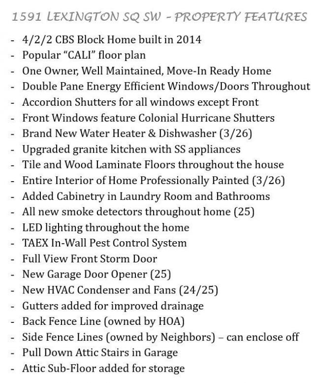 Great HOUSE at a GREAT PRICE! Oringinal owner and extremely well maintained. Move-in ready 4 BR/2 BA home loaded with extras like an updated granite kitchen w/ SS appliances, tile and wood floors throughout, feshly painted interior, new water heater & dishwasher and accordion shutters. This home features Solid CBS block construction, double pane energry effecient windows, LED lighting throughout, TAEX in wall pest control system, pull down attic stairs and attic sub floor for storage. There are also All new smoke detectors, updated HVAC condenser and fan and a new garage door opener. Outside there are gutters, front storm door, and upgraded decorative colonial hurricane shutters on the front windows. Gated community, HOA cares for lawn too.