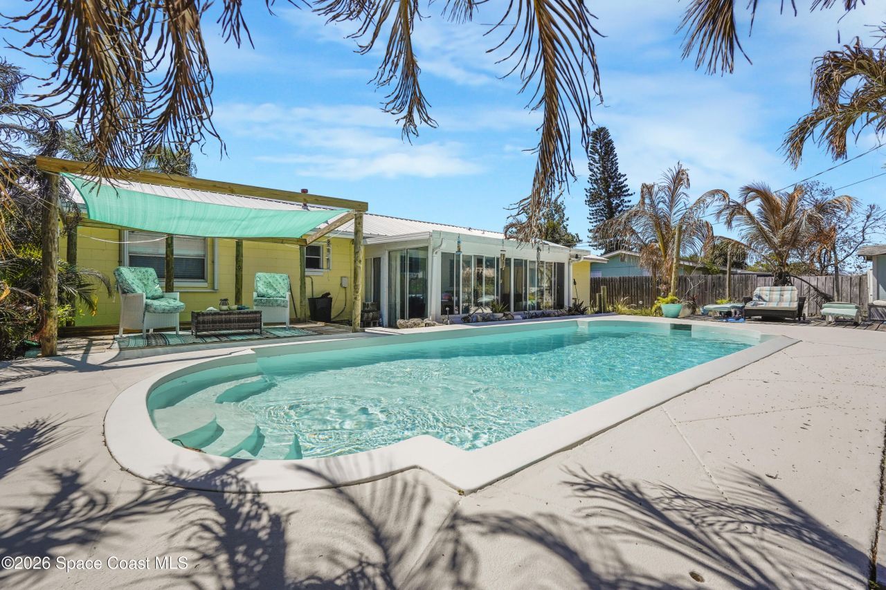 This 3-bedroom, 2-bath home offers 1,297 sq ft of updated living space with a functional layout. The renovated kitchen features quartz countertops, stainless steel appliances, and a Café gas oven, opening to the main living area.Major updates include a 2018 metal roof, 2016 HVAC, 2023 water heater, and gas heating. The back porch features glass sliders for enclosed or screened use year-round.Step outside to your private backyard and relax by the pool in the in-ground saltwater pool with sun shelf, plus ample space for seating and entertaining. RV/boat parking adds flexibility for storage and Florida living.Not in a flood zone, Rocket launch views, Spacious, usable yard! Schedule your showing today.