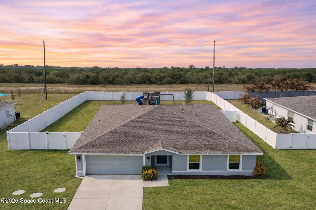 Built in 2022, this 4-bedroom, 2-bath home offers a desirable split floor plan on a spacious 0.23-acre lot with no HOA. The open-concept design features a bright kitchen that flows seamlessly into the living and dining areas, perfect for both everyday living and entertaining.The kitchen is enhanced with a custom barn door pantry and connects to a stylish built-in bar area, adding both charm and functionality. Thoughtful upgrades include impact-rated windows, an in-wall pest control system, whole-house water filtration, reverse osmosis drinking water, and an upgraded laundry room with added cabinetry and counter space.Step outside to an oversized, fully fenced backyard with plenty of space for gatherings, pets, or a future pool, plus the added bonus of beautiful sunset views. Move-in ready with modern finishes throughout.