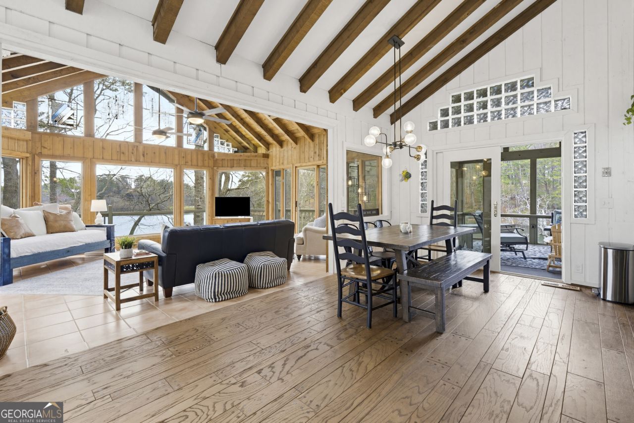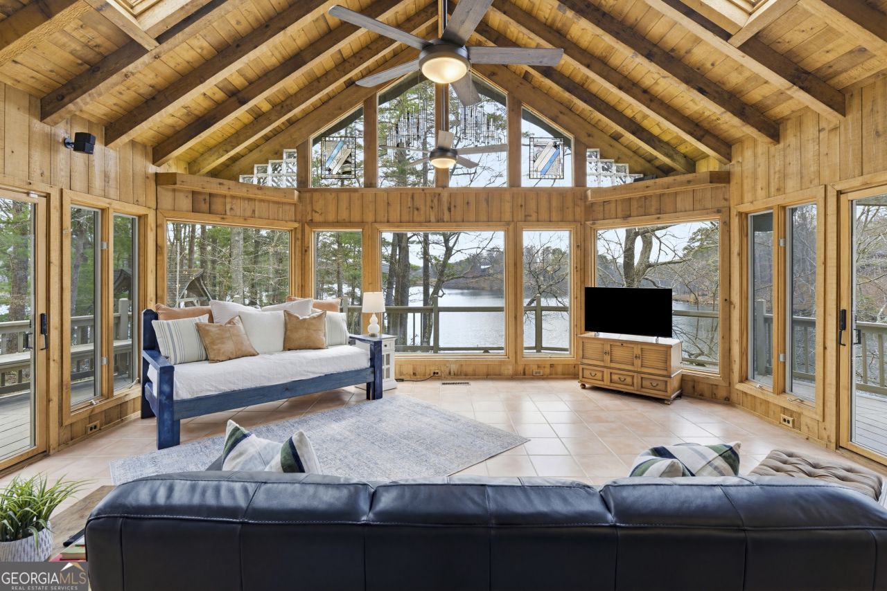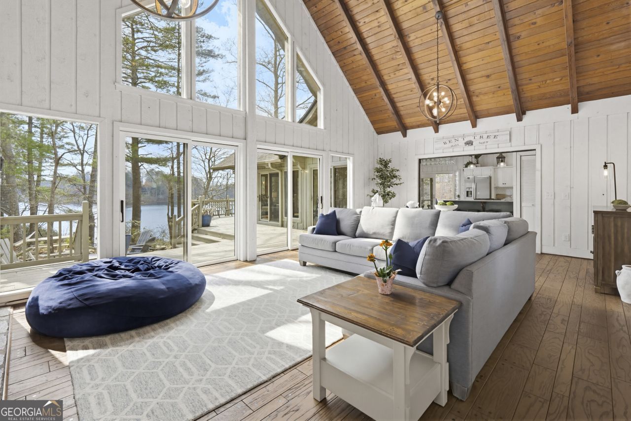 Water Water Everywhere! You won't believe the 280 degree views of Lake Tamarack! Truly the prettiest lot in Bent Tree, this home, being offered fully furnished, sits on a point with panoramic views of the lake from every single window! A true and tranquil escape, surrounded by water and greenery. The wrap around decks allow for endless outdoor entertaining and relaxation. Whether you are sitting on the back porch, sipping coffee and taking in the water/mountain views or swinging on the porch swing with a glass of wine while enjoying the sunset...this is a sanctuary you and your guests will never want to leave. No neighbors to your left, just greenery, privacy and water! You have a long, level driveway for amble parking and two garages for all of your water toys (included in sale!) This one of a kind chalet home offers large living spaces, so there is plenty of room to spread out. There is a large family room with stone fireplace, beautiful wood flooring and a wall of glass windows to enjoy the spectacular view. The renovated kitchen is fun and bright with quartz countertops and space for the large dining table that leads you to the stunning sunroom with wall to wall windows and the most incredible view of the lake and mountains you've ever seen! the main level boasts two generous bedrooms and a full, renovated bathroom. There is also a half bath off the living space. Upstairs the is a huge Primary Suite/Loft with double walk in closets and it's own renovated ensuite bath and balcony. There is another bedroom, for your over flow guest, above the garage. Adjacent to one of the two garages is a game room to keep the teens busy when it's too dark to be kayaking, fishing, golfing, playing tennis, pickleball, or hiking! Basement offers an addition room for an office, workout room, storage...whatever you need, in addition to a workshop. This has been a beloved family lake house and very successful AirBnB. It is being sold fully furnished, including lake toys and would make a one of a kind year round or weekend retreat. Bent Tree offers Golf, Pools, Tennis & Pickleball, Stables, boating and the 18th Hole restaurant and pro shop. Did I mention the community is gated?!! Don't miss out on this spectacular setting to call your own little slice of paradise!
